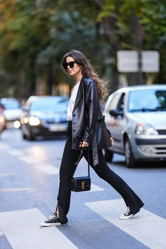 现在这个“胡乱穿衣”的季节,皮衣外套还能匹配不少夏季内搭。时尚博主Ketevan Giorgadze示范的皮衣穿搭也很值得借鉴,简单利落的皮衣搭配T恤长裤,又藏了一些“小心思”在:裤子前面的开衩设计能在视觉上拉长小腿长度,金属logo的包包又能让造型更有记忆点。