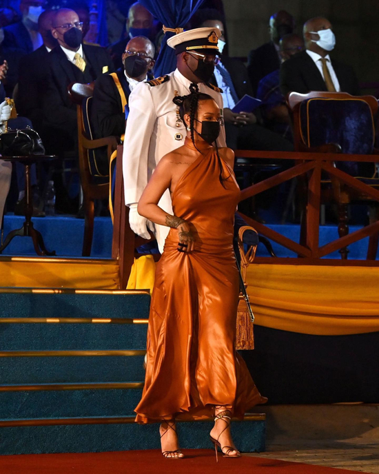 去年12月,加勒比海岛国巴巴多斯正式改制成为全球新的共和国,作为巴贝多的特命全权大使的Rihanna,以一身单肩长礼服出席典礼,接受册封。