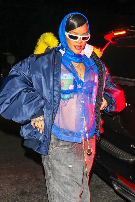 Rihanna没有选择养尊处优,而是每天都高调出街。前几日的超级碗上,Rihanna穿着一件有黄色毛边的Balenciaga飞行员夹克,搭配Maison Margiela的不规则牛仔裤。