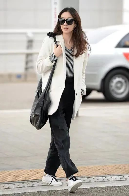 私下的机场穿搭就把难得的休闲感跟上,小白鞋和旧皮质单肩包都是不错的点睛之笔。