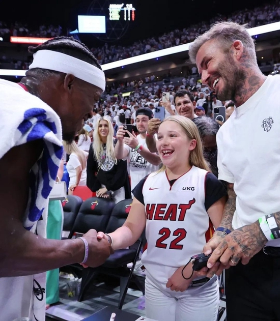 老贝带着女鹅小七一起在迈阿密热火主场观战与老鹰的比赛,与热火队球员Jimmy Butler碰面。小七的眼睛都在冒星星,追星成功jpg。