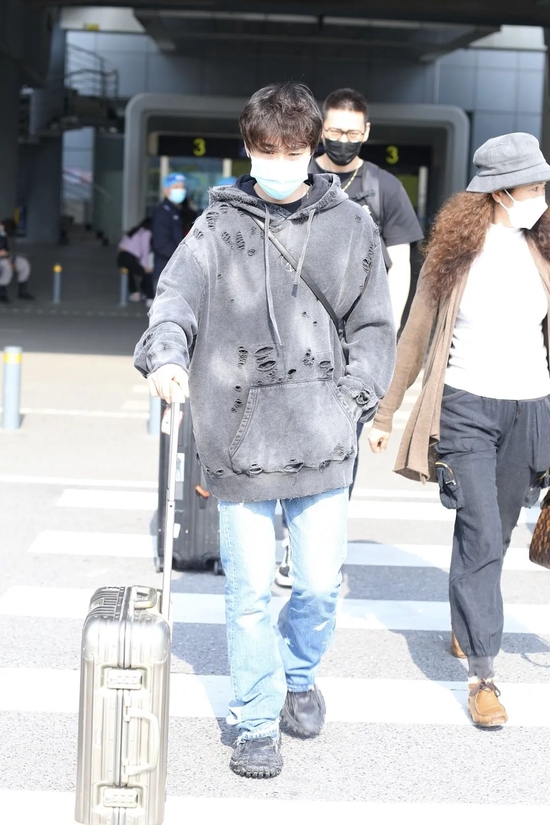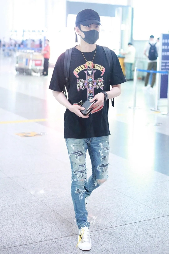 付辛博独自现身机场,黑色鸭舌帽与印花短袖黑T的组合,再加上破洞牛仔裤,脚上还是经典国潮:回力运动鞋。这一套让人梦回古早街拍的Style,太是那味儿了!