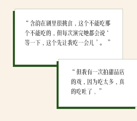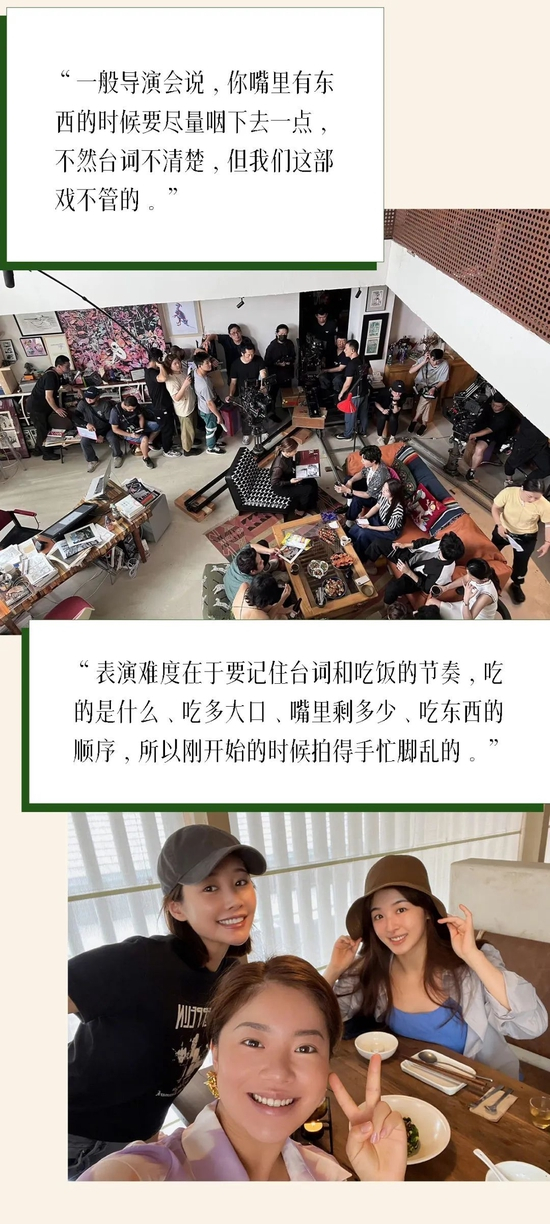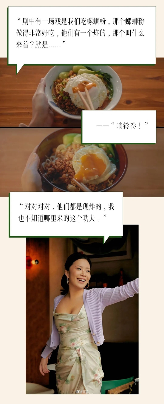 因为不知道要拍多少条、要吃多少遍,《爱很美味》剧组总是会备好足量的食物,王菊答不出哪个食物让她印象深刻,但她记得都很好吃。