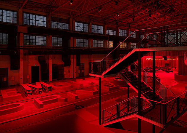 空旷的展览空间分为上下两层,一层设有图书馆和小剧场,图书馆的图书供参观者现场借阅,书架和休息区被设计成巨大的红色字母“Mademoiselle Privé”,从二层往下看会整体效果会更赞。