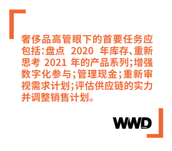 麦肯锡咨询公司认为,奢侈品高管眼下的首要任务应包括:盘点 2020 年库存、重新思考 2021 年的产品系列;增强数字化参与;管理现金;重新审视需求计划;评估供应链的实力并调整销售计划。