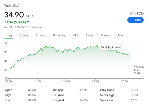 这次合作的确取得了非常好的反馈,消息发布之后的几天,Tod‘s股价飞涨,截至当周周五收盘,Tod’s成为意大利FTSE全股指数( FTSE Italia All-Share Index)当天表现最好的股票。