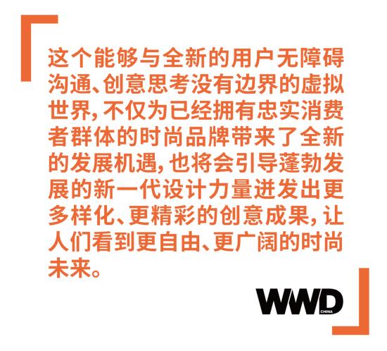 对于很多人来说,这一次的元宇宙时装周也许依旧看起来与想象中的“元宇宙”有着很大的差距,但这个能够与全新的用户无障碍沟通、创意思考没有边界的虚拟世界,不仅为已经拥有忠实消费者群体的时尚品牌带来了全新的发展机遇,也将会引导蓬勃发展的新一代设计力量迸发出更多样化、更精彩的创意成果,让人们看到更自由、更广阔的时尚未来。WWD