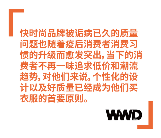 另外自去年疫情之后,快时尚品牌在市场中的生存空间在不同程度上都受到了压缩,消费者留给快时尚品牌的预算也越来越少。相反,他们更愿意把有限的预算花在具有保值空间的奢侈品成衣上。同时快时尚品牌被诟病已久的质量问题也随着疫后消费者消费习惯的升级而愈发突出,当下的消费者不再一味追求低价和潮流趋势,对他们来说,个性化的设计以及好质量已经成为他们买衣服的首要原则。