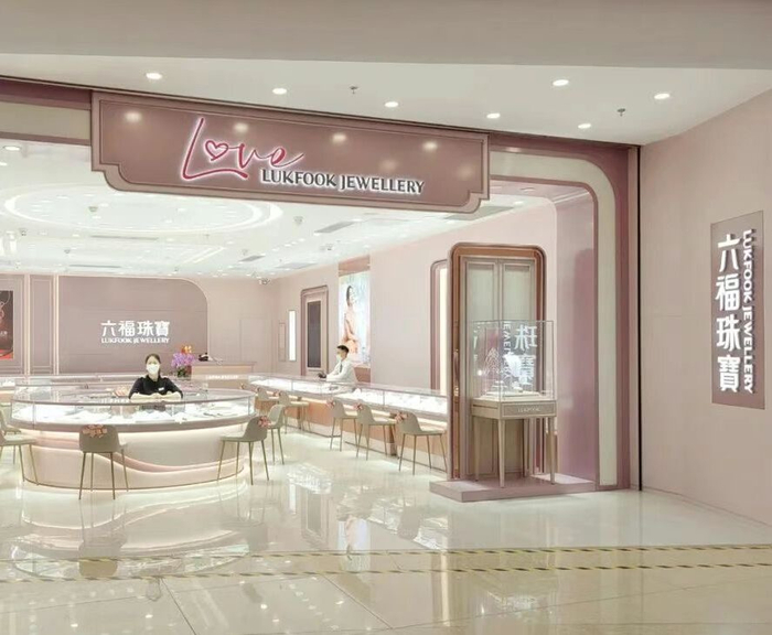 这间品牌店位于湛江市新兴城市综合体项目鼎盛广场内。Love LUKFOOK JEWELLERY品牌店以粉色为主视觉基调,营造温馨浪漫的氛围。