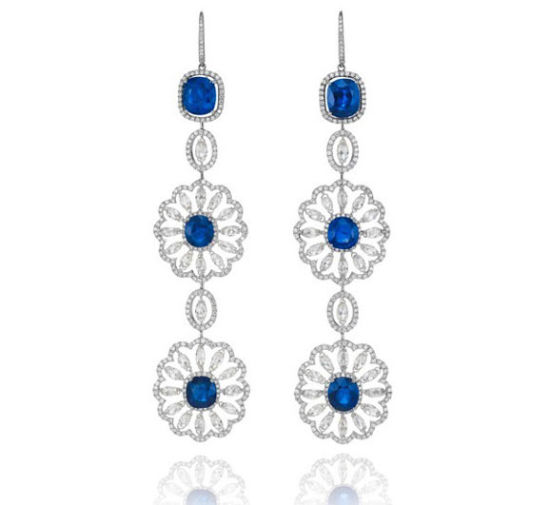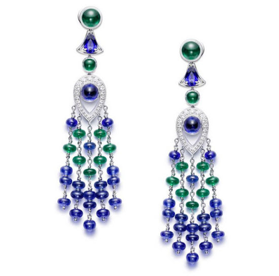 18K白金耳环,镶衬36颗蓝宝石珠(约重13.86克拉) 、14颗祖母绿宝石珠(约重3.94克拉) 、2颗蛋面形切割蓝宝石(约重1.75克拉) 、2颗蛋面形切割祖母绿宝石(约重1.67克拉) 、2颗梨形切割蓝宝石(约重0.83克拉) 及48颗圆形美钻(约重0.29克拉)