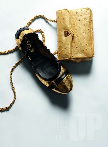LANA MARKS 金色晚装包&TOD’S金色蟒蛇皮轻便鞋1984年,Lana.J.Marks女士受邀参加伊丽莎白二世女王的生日宴会,她苦苦寻觅却也没有找到一款用来搭配红色礼服的鳄鱼皮手袋,于是,她决定在美国开创自己的手袋品牌。Lana Marks是世界上唯一一个专注于制造高端稀有皮革配饰的奢侈品牌,她那长长的显赫的客人名单足以说明一切:戴安娜王妃、卡拉·布鲁尼,劳拉·布什、安吉利娜·茱丽……
