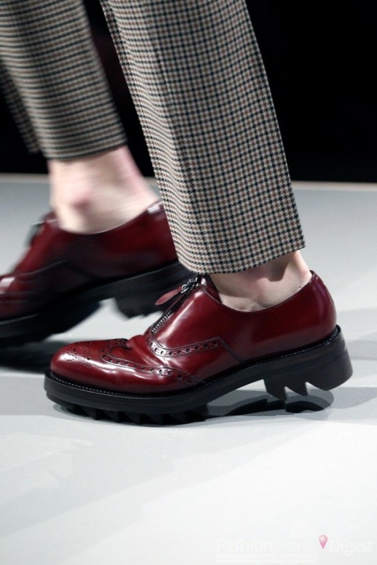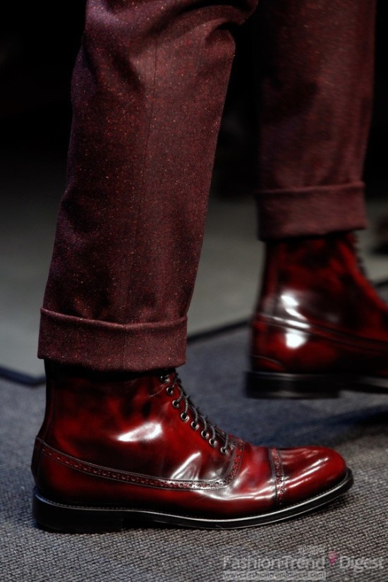 酒红色系是本季米兰秀场上的核心色系。尤其把宝石红结合高抛光的材质是鞋履最主要的趋势方向。Zegna的酒红色皮鞋依然看起来中规中矩,一派正装风格;而Prada的超级防滑底和拉链设计令鞋子显得十分另类;在Canali的1314秋冬系列中,酒红色系本来就是一个重要的色系,而光亮的踝靴结合宝石红色颇有复古气质。