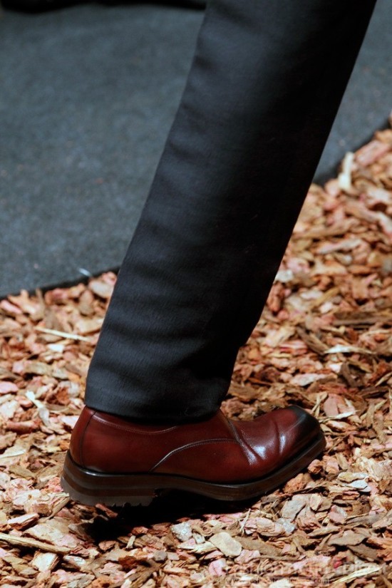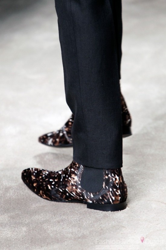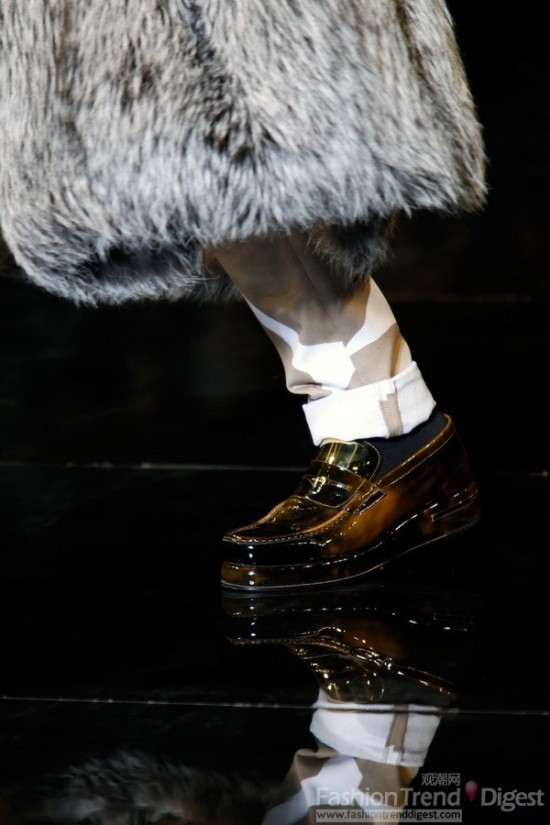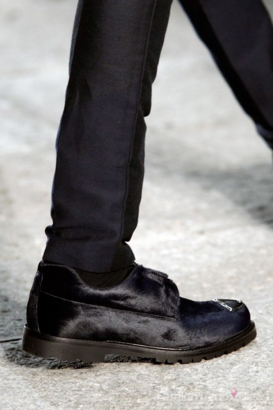 奢华的毛皮被更广泛地应用于米兰的男鞋中,尤其是贵族气质的马毛皮。Burberry的尖头和动物纹印花以及马毛的结合非常吸引人眼球。Neil Barrett的皮鞋具有厚重的轮廓,和马驹皮的结合极具时尚气息。而John Richmond把矿石色系的宝石红与祖母绿的搭配令马毛材质熠熠生辉,呈现丝缎般的奢华效果。