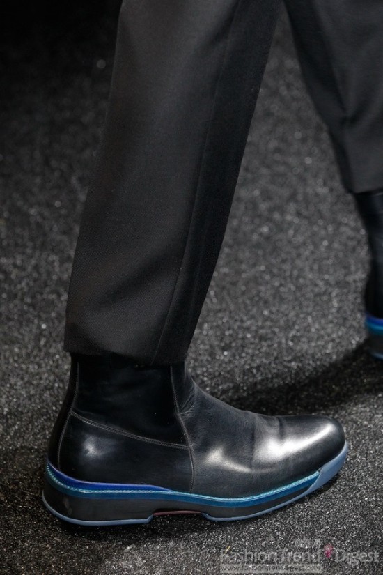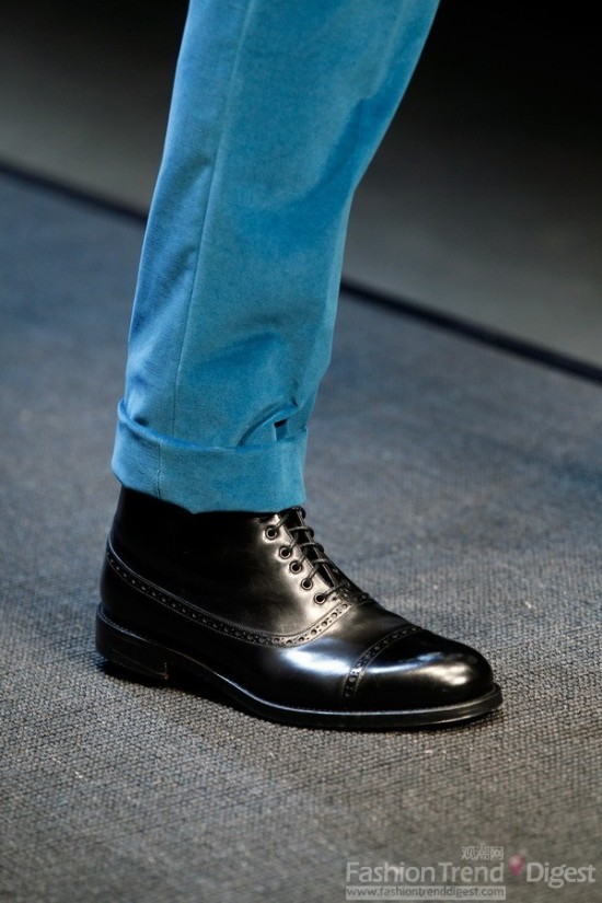 米兰时装秀上当然不乏洒脱或另类的男装系列,但总体上来看,或奢华或内敛的正装风格却是本次秀场主体,这也非常符合这些大牌男装的一贯经典定位。比如从Bottega Veneta的奢华绅士, Burberry Prorsum的复古经典到Zegna的优雅大气,这些主流男装品牌依然尽力凸显着主流审美价值观。在此风格主导之下,西装与经典的外套设计成为米兰秀场的主体单品,从经典的双排扣西装到大衣。这一风格进一步催生了正装风格的男士踝靴,尤其是具有修长鞋型的高光皮质踝靴是主打的款式。而搭扣、面料拼接等细节变化,或采用马毛皮、鳄鱼皮等奢华皮质是主要的趋势。另外如Burberry Prorsum的印花在经典之外呈现了花花公子的气息。