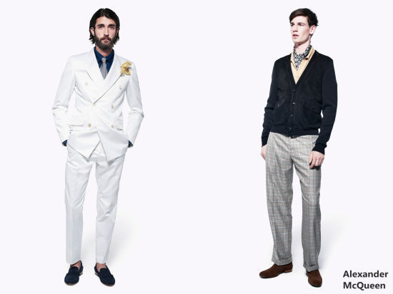 亚历山大-麦昆2013春夏系列穿出20年代的风味,并不以为着完全按照盖茨比的行头置办一身儿衣裳,毕竟阔脚裤、细条纹再加上小圆领不是谁都能hold得住的,而且完全照搬会有穿出老古董的危险,但是,20年代男装的几大特点可以给男士们的日常着装非常多的启示,关键的关键,就是要找到“古”与“潮”之间的平衡点。