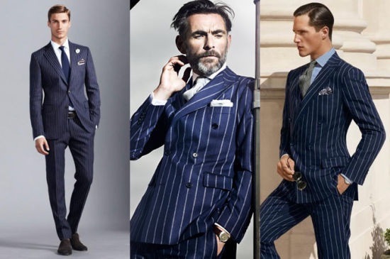 将现代的西服剪裁与细条纹布料结合,选择贴身的剪裁和稍窄的领部设计,搭配简单的温莎结领带,呈现复古风情商务造型。