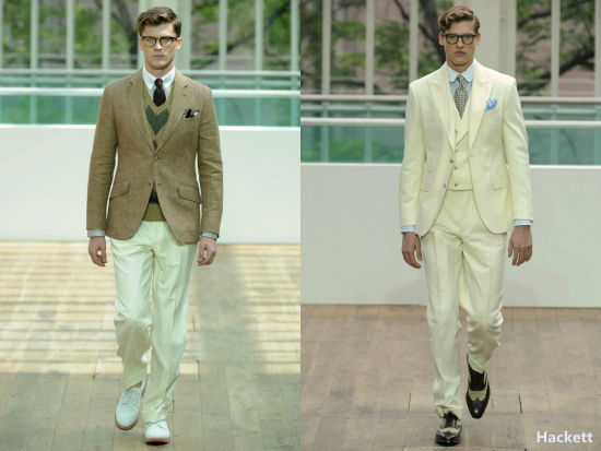 20年代风格给不少男装品牌的2013春夏带去了灵感,比如美国品牌拉夫-劳伦(Ralph Lauren)、英国品牌哈克特(Hackett)、意大利品牌卡纳利 (Canali)、还有英国品牌亚历山大-麦昆(Alexander McQueen)等。