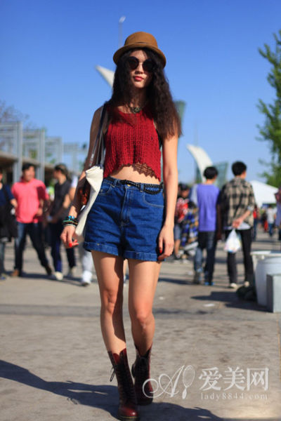 时尚点评:酒红色针织短背心搭配深蓝色的牛仔短裤,非常具有和谐感的搭配!朋克风格十足的女郎feel!热力四射的装扮LOOK!