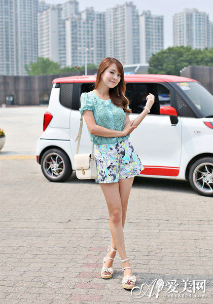 出彩的印花高腰短裤修出腰部的曲线,选择天蓝色的蕾丝上衣搭配刚好与短裤上的颜色相对应,清新优雅。