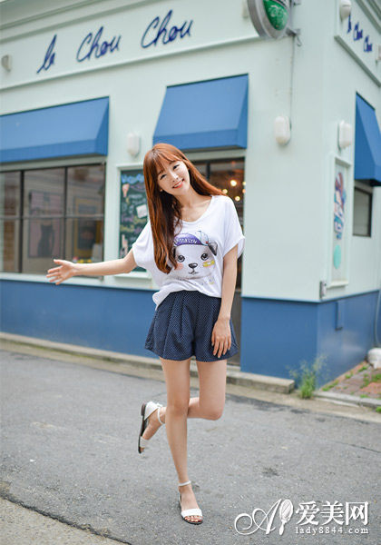 蓝黑色短裤+白色可爱t恤搭配Tips:蓝黑色短裤+白色可爱t恤