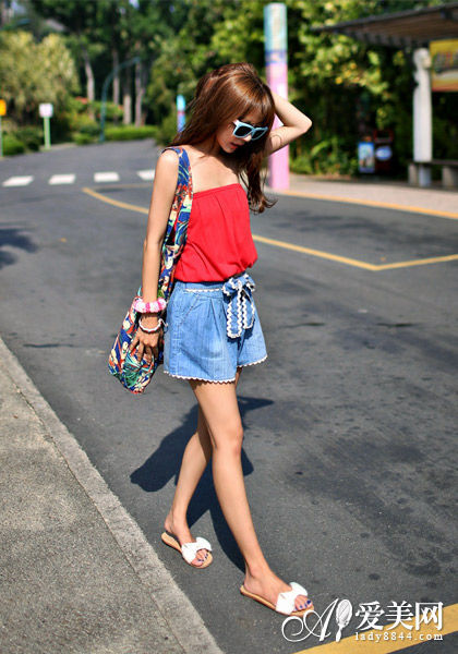 牛仔绑带短裤+红色抹胸雪纺背心搭配Tips:牛仔绑带短裤+红色抹胸雪纺背心