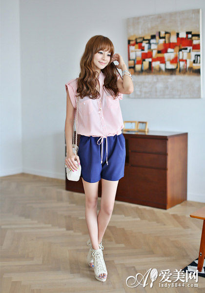 OL们上班总是希望轻松时尚又漂亮,这套深蓝色束腰短裤搭配粉色系雪纺无袖上衣一次过满足这三个愿望,轻松休闲的高腰短裤既时尚又能突出身材的曲线,粉色系的雪纺无袖上衣斯文优雅,展现女性气质,加上一双能够修饰长腿的绑带高跟鞋,轻松自在有漂亮。