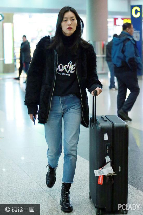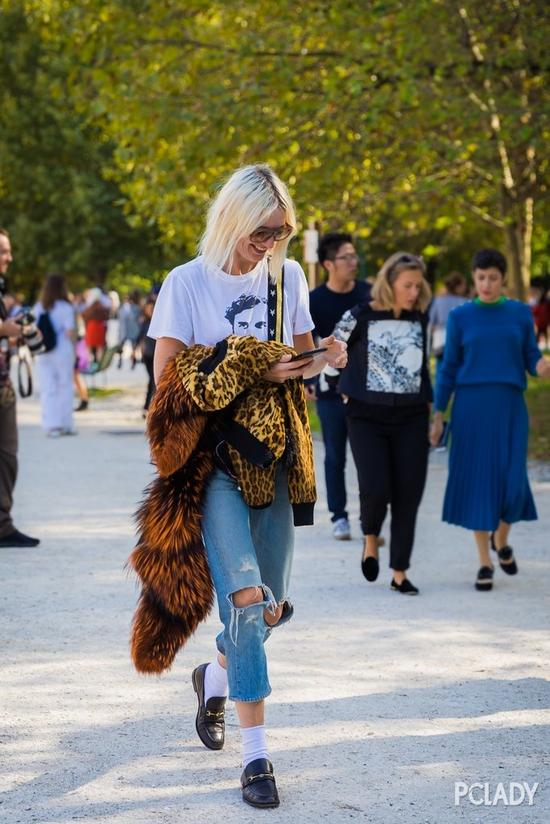 白T恤、牛仔裤+平底鞋的清纯减龄组合,完全了破除皮草的严肃气息。