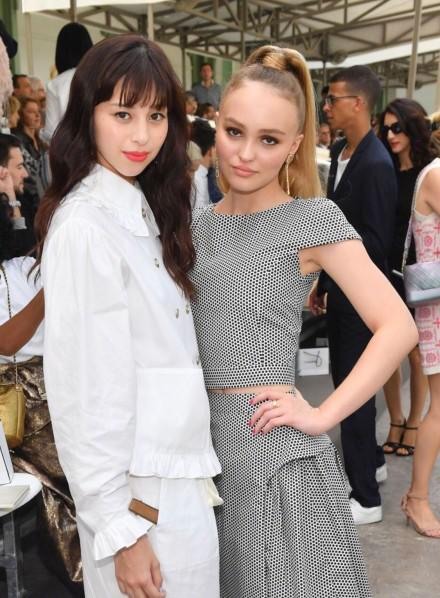 日本女星中条彩未一身白色套装和德普女儿Lily Rose同框合影。