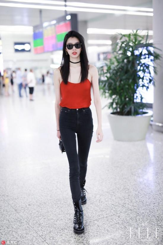 V领/U领吊带配裤装时,下身要尽量简洁,呈现出吊带性感却不卖弄的大气。比如奚梦瑶红黑撞色,除却chocker以外,全身没有复杂的元素和配饰,明朗而从容,不失冷毅、不失轻盈。