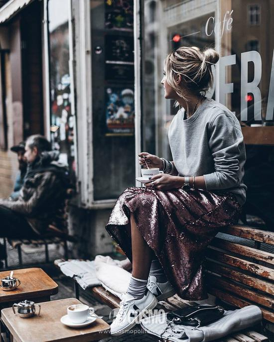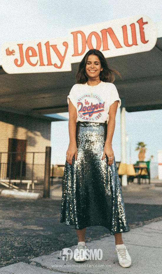 虽说只是很基本的上衣配裙子的搭配方式,但因为裙子的亮眼程度,上衣也无须有过多的设计,所以简约朴素的上衣设计才是闪片裙最好的搭配选择。