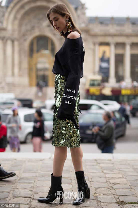 除了说在搭配亮片裙时应该选择一些朴素的单品之外,其实我们也可以发现,比起贴身款的亮片单品,时髦精更喜欢相对宽松的款式。贴身的亮片单品往往会给人一种过分艳丽的感觉,所以在打造更为时髦的造型的时候,一众时髦精会选择不是那么贴身的设计。