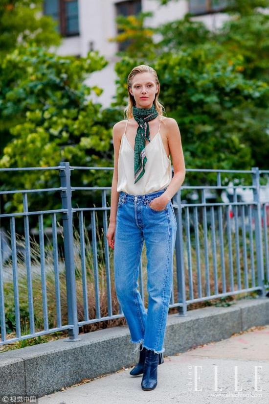 时尚博主Alexandra Lapp这身造型一反往日简洁霸气的造型,白色缎面背心下搭牛仔裤,外搭同样质地轻薄的风衣,清爽拉风的造型率真个性。