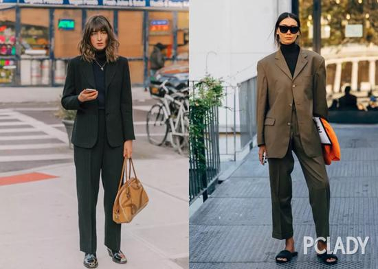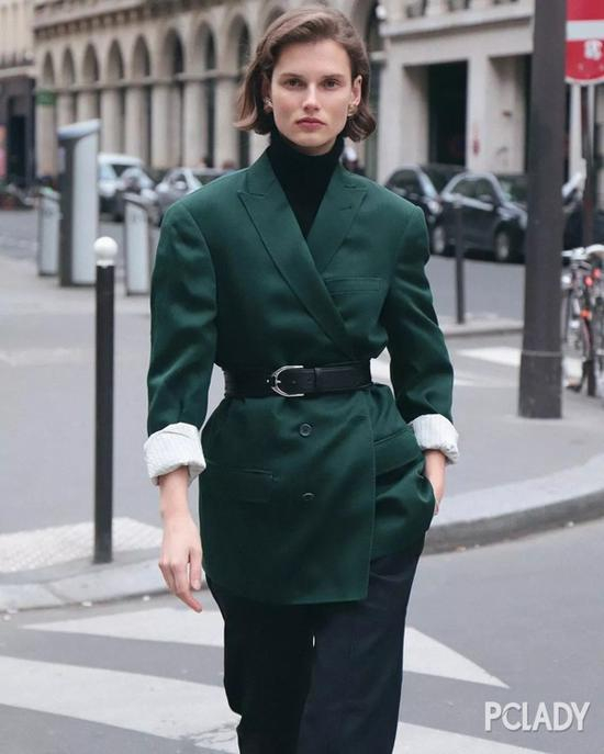 黑色针织衫的厉害之处就是它能分分钟让西装外套看起来低调有内涵!翻驳领西装外套+高领针织衫,整个人看起来十分大方精致,不用特意拗造型,都能混身上下透出一股时髦街拍范儿。