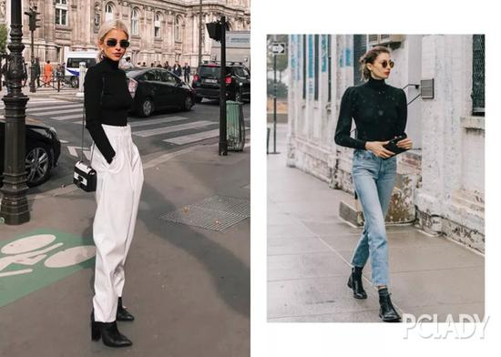 今年的秋冬街拍,十个时尚达人就有九个在穿黑色针织衫。对于今年最潮外套—机车皮衣这种一般人穿不出范的单品,黑色高领针织衫就能让你瞬间变身高街Icon。