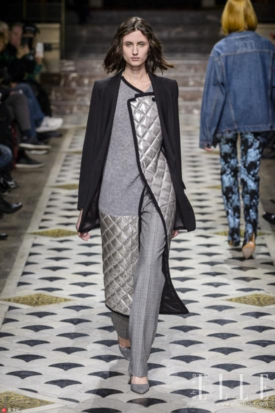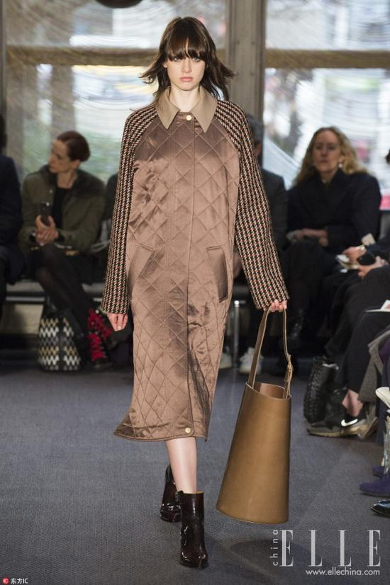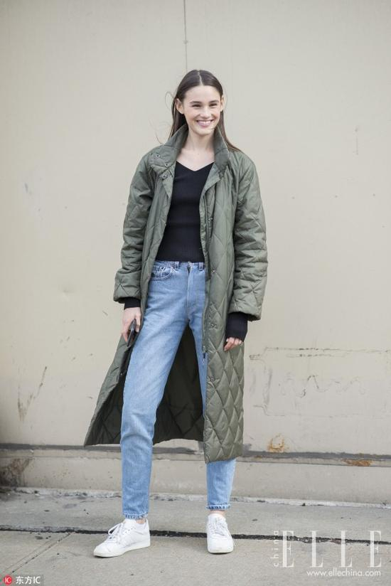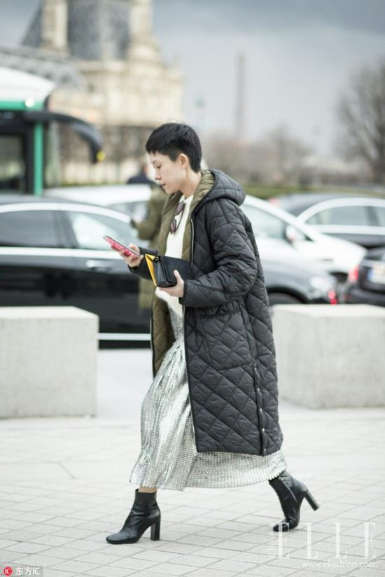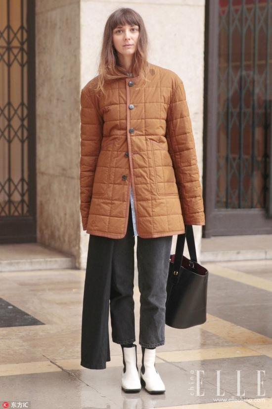 中长款式的绗缝棉服还可以给下半身搭配今年流行的烟囱裤和切尔西靴,显出帅气的利落感。