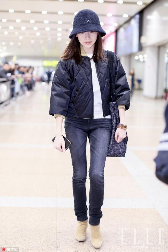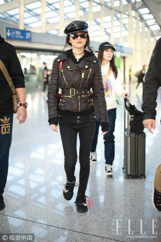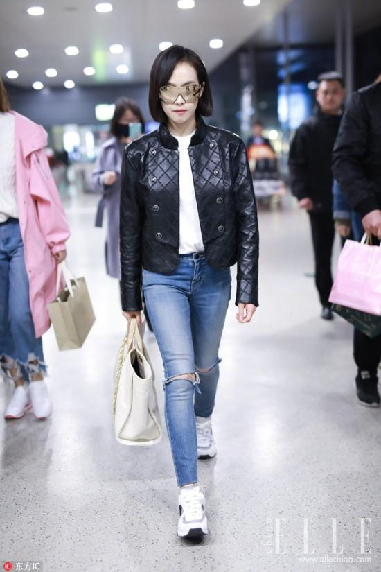 宋茜的这身机场look则是将绗缝元素演绎到了夹克上,搭配上高腰牛仔裤和老爹鞋,是气场十足的冷酷范没错了。