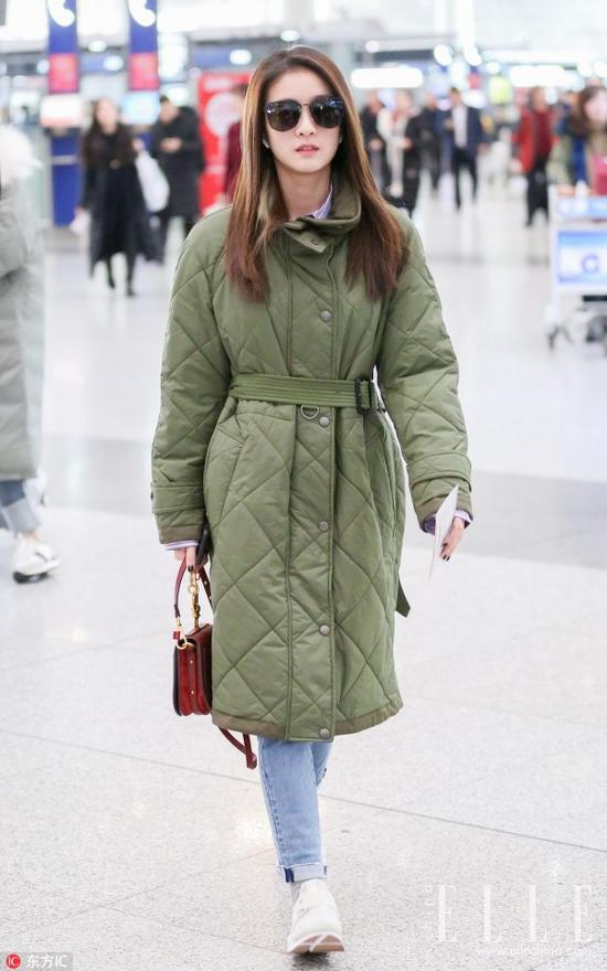 在日常穿搭上,长款的绗缝棉服在颜色的选择上可以相对保守一些,驼色和军绿色这两个冬天的王牌安全色都是不错的选择,也很百搭。张雪迎就选择了用身上这件军绿色的Burberry的绗缝风衣来搭配浅色的牛仔裤和运动鞋,手上这只黑红拼色的Chloé Nile手袋则给整体造型多了一些亮点,打破了大色块的沉闷感。