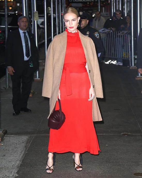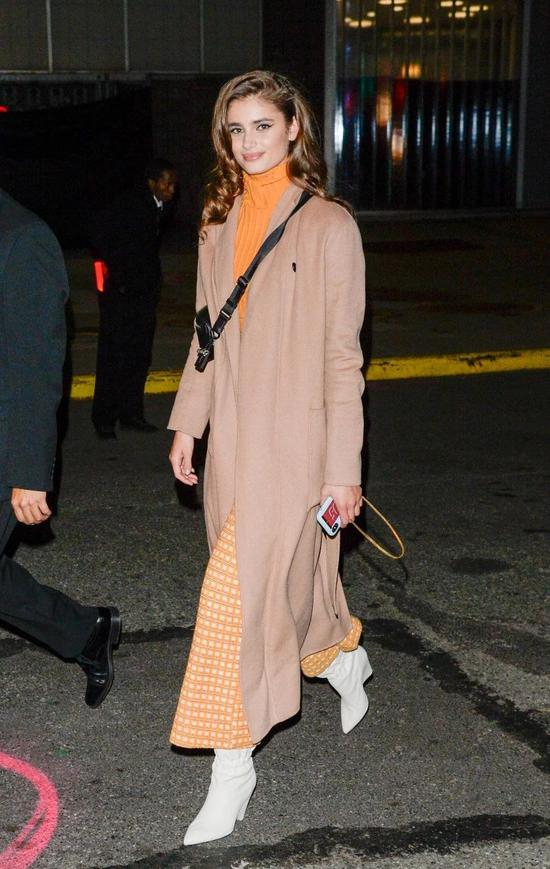 冬天穿裙子的女人也并不是不要温度,像Taylor Hill这样,大衣里搭一件高领针织长裙,看起来就很温暖。