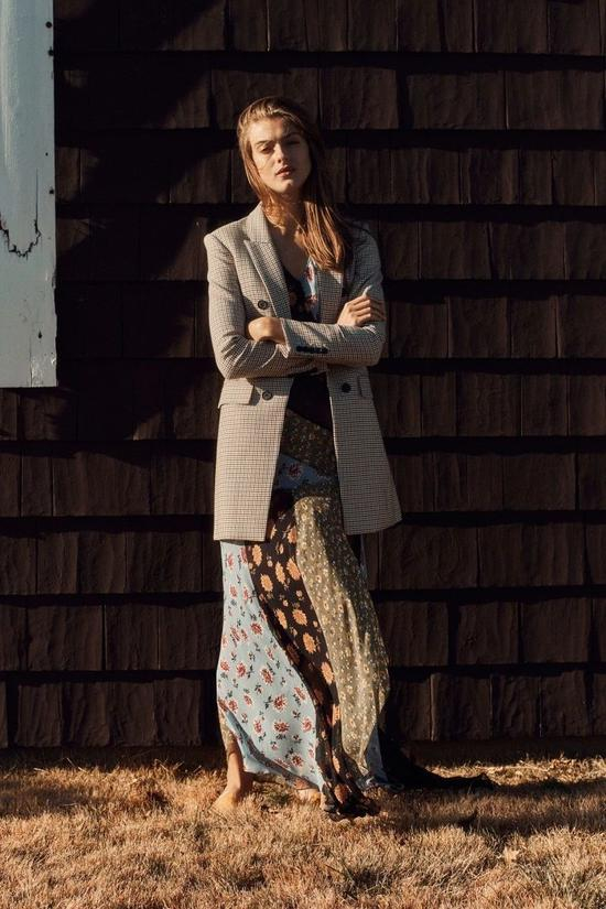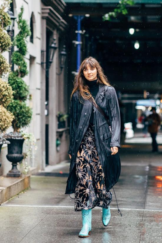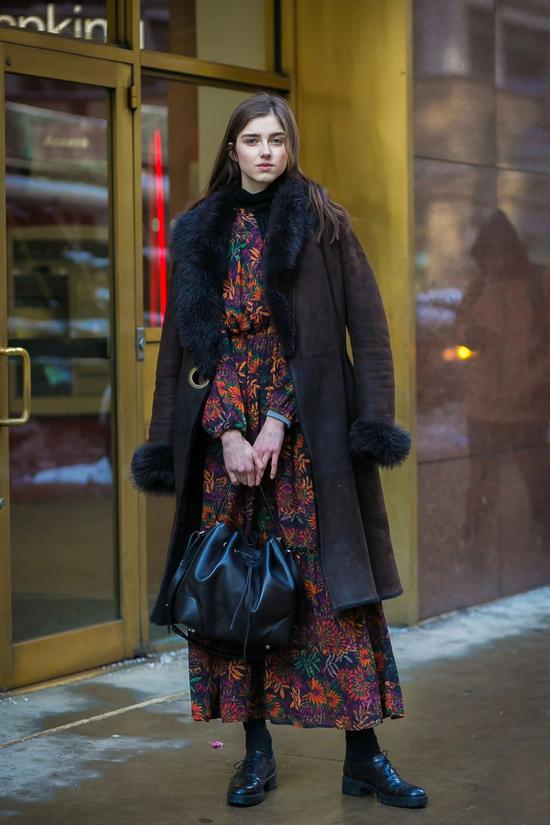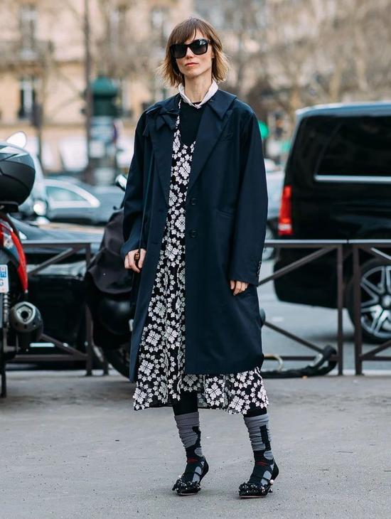 秋季单穿的花朵连衣裙别急着收起来,穿在颜色浓重的大衣里可以为全身增加清新的氛围,这个冬天并不暗淡。