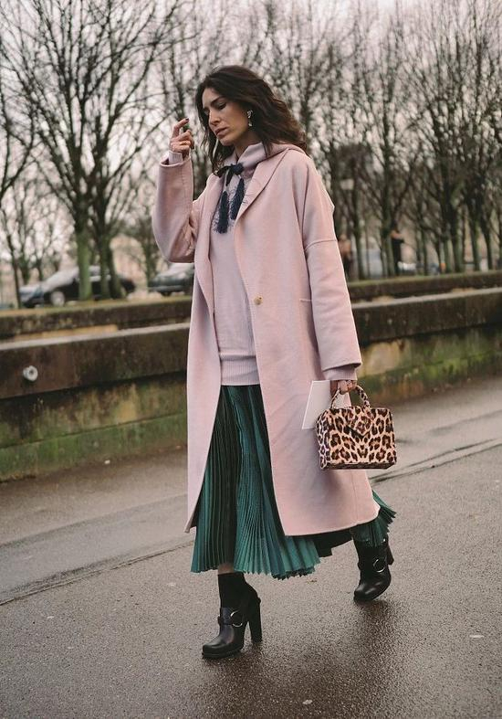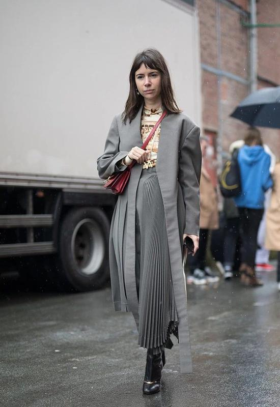基础色互相搭配肯定是安全牌,不会出错,大衣和裙子选择相同的色系或元素去统一整体,也能美得很自然,这时候,亮点就可以是一条设计特别的裙子,比如百褶裙。