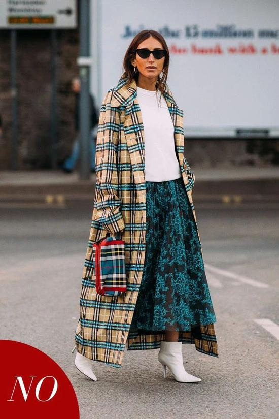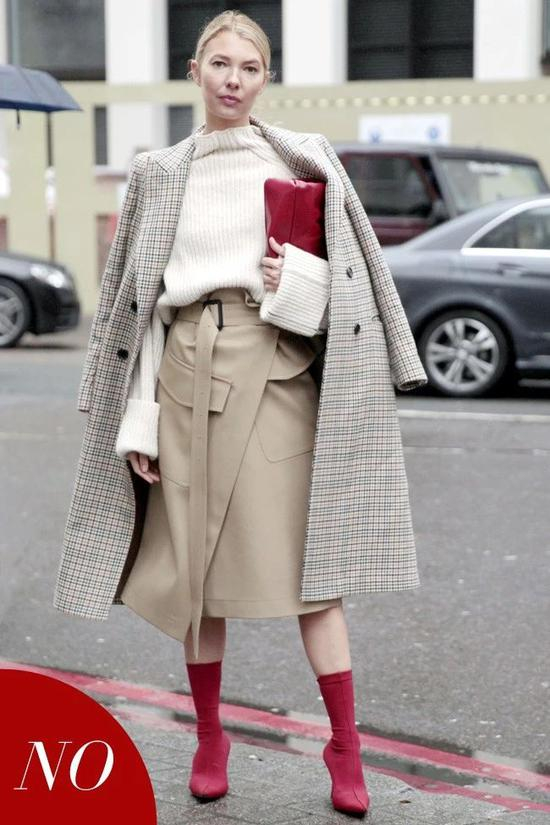 无论是大衣还是裙子,大多数人都会选择过膝的款式,一不留神就会正好选到大衣和裙子长度几乎相同,下摆同时“卡”在小腿最粗处的位置。