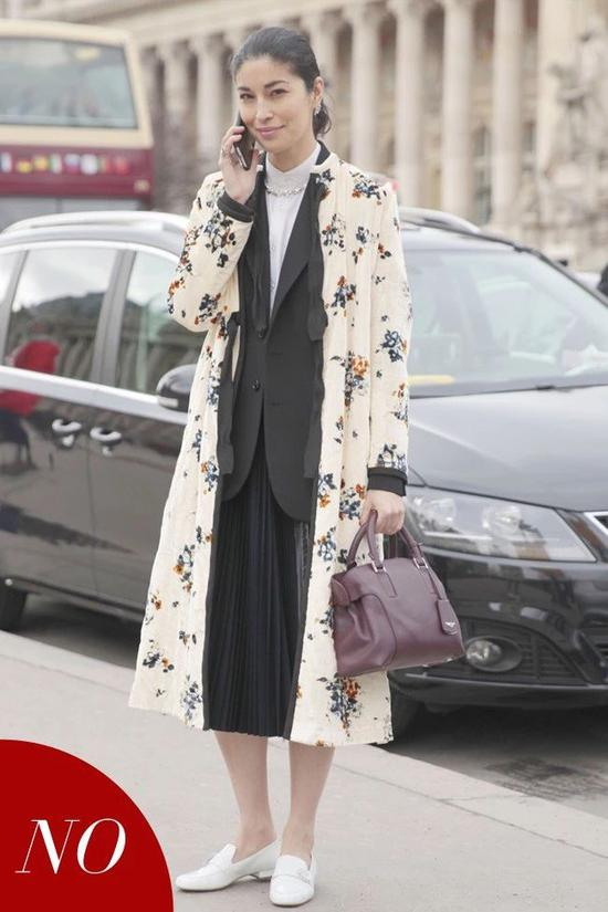 比如最常见的,是H型大衣+A字裙的组合。H型大衣本身剪裁垂顺又流畅,搭配有大幅度突起的A字裙,直线条被破坏了不说,还会造成一种视觉上的膨胀感。