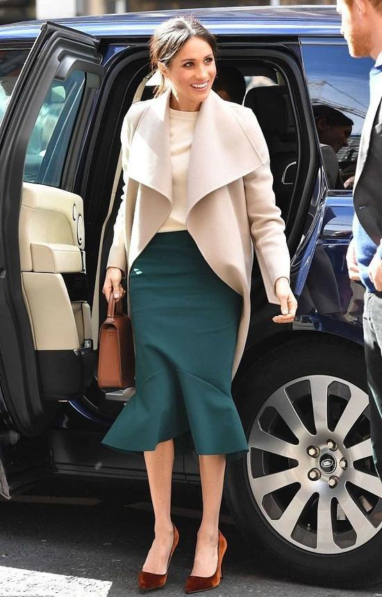 梅根王妃在冬天也很喜欢穿大衣+裙子,显得特别端庄。
