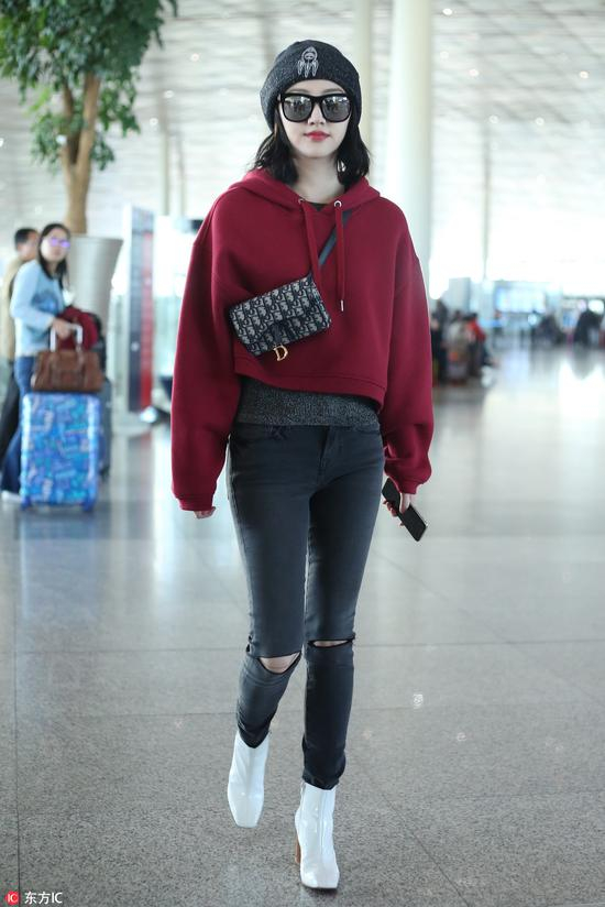 景甜选择白色漆皮方头短靴搭配烟灰色牛仔紧身裤和卫衣,造型简单大方。瑞酱建议腿型不完美的女孩最好选择与裤装同色的短靴才不会显得腿短。