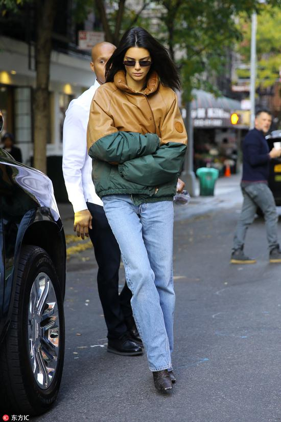除了紧身裤之外,搭配方头裸靴的另一个神器就是Mom Jeans。Kendall就选择了一条浅色Mom Jeans,长度到脚背露出方头与蛇纹就很时髦。