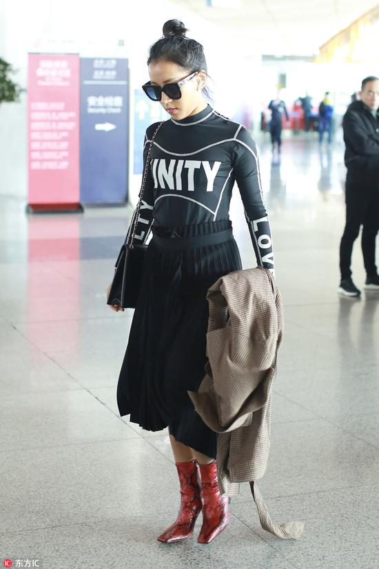 吉克隽逸以All Black运动风造型现身,脚上的红色蛇纹方头靴是整体Look的点睛之笔。