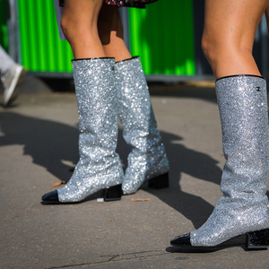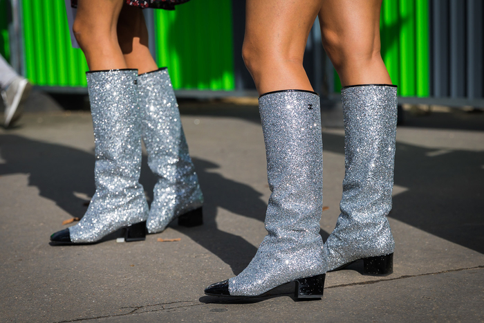 如果你选择将丹宁风的单品成套装,那么一双惹眼的金属色方头短靴来做搭配就再适合不过了。