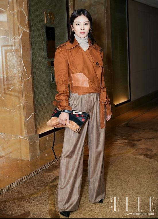 刘涛身穿Loewe焦糖色拼皮长腰带短夹克,内搭Max Mara 2017秋冬系列米色高领针织衫,下身穿Max Mara 2017秋冬系列咖啡色条纹阔腿裤,手拿Loewe红黑波点印花手袋。短夹克与阔腿裤顺色穿搭,尽显高级气场。