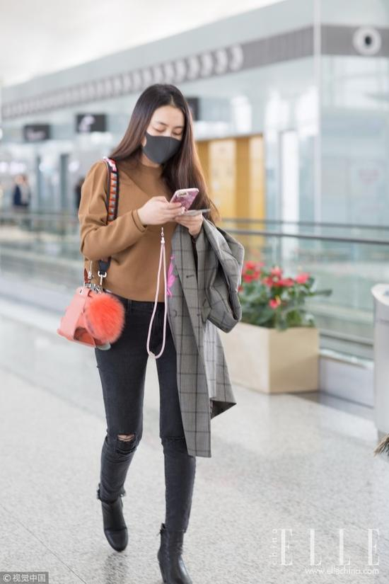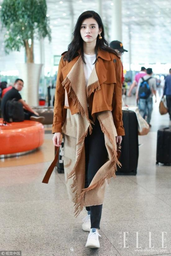 奚梦瑶身穿Loewe焦糖驼色拼色流苏镶边毛呢大衣外套,内搭白色T恤,手拎棕色Loewe系带迷你手拎包,下穿灰色紧身牛仔裤,脚穿白色Adidas休闲运动鞋。焦糖色与基础黑白搭配简单又清爽。