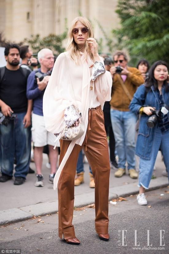 阔腿裤是时髦利器没错,焦糖色阔腿裤让时髦度翻倍。搭配衬衫,职场形象不再严肃死板,而是变得活力起来。